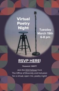 Join the Equity, Diversity and Inclusion Fellows from The Office of Diversity and Inclusion as they host virtual poetry night! Come prepared to perform your best spoken word!