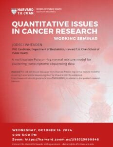 Jodeci Wheaden, PhD Student, Department of Biostatistics, Harvard T.H. Chan School of Public Health A multivariate Poisson-log normal mixture model for clustering transcriptome sequencing data Abstract: This talk will discuss…