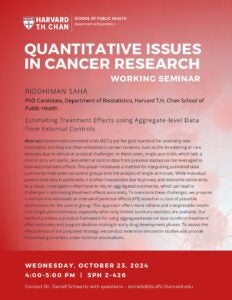 Riddhiman Saha, PhD Student, Department of Biostatistics, Harvard T.H. Chan School of Public Health Estimating Treatment Effects using Aggregate-level Data from External Controls Abstract: Randomized controlled trials (RCTs) are the…