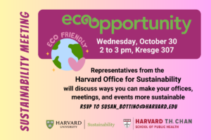 Join us to hear from representatives from the Harvard Office for Sustainability. They will share information and tips on how to make your offices, meetings, and events more eco-friendly. Light…