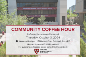 The Harvard Humanitarian Initiative (HHI) invites you to join us for a Community Coffee Hour on Thursday, October 3rd, from 11:00 am to 12:00 pm at Harvard Chan, Building 1,…