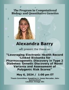 Thesis Defense: Alexandra Barry Time: Monday May 6, 2024, at 1:00 PM Eastern Time Location: Kresge 201 Alexandra will present the thesis titled “Leveraging Electronic Health Record-Linked Biobanks for Pharmacogenetic…