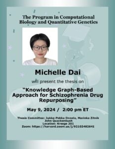 Thesis Defense: Michelle Dai Time: Thursday May 9, 2024 at 2:00 PM Eastern Time Location: Kresge 201 Zoom: https://harvard.zoom.us/j/92102482641 Michelle will present the thesis titled “Knowledge Graph-Based Approach for Schizophrenia…