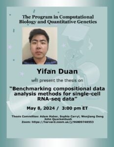 Thesis Defense: Yifan Duan Time: Wednesday May 8, 2024 at 3:00 PM Eastern Time Location: FXB G03 Zoom: https://harvard.zoom.us/j/96809748553 Yifan will present the thesis titled “Benchmarking compositional data analysis methods…