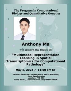 Thesis Defense: Anthony Ma Time: Wednesday May 8, 2024 at 11:00 AM Eastern Time Location: FXB G03 Zoom: https://harvard.zoom.us/j/94566387781 Anthony will present the thesis titled “Multimodal Representation Learning in Spatial…