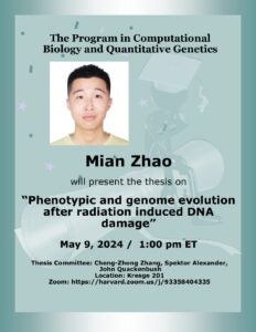 Thesis Defense: Mian Zhao Time: Thursday May 9, 2024 at 1:00 PM Eastern Time Location: Kresge 201 Zoom: https://harvard.zoom.us/j/94566387781 Mian will present the thesis titled “Phenotypic and genome evolution after…