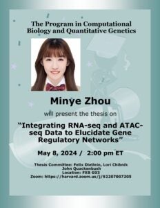 Thesis Defense: Minye Zhou Time: Wednesday May 8, 2024 at 2:00 PM Eastern Time Location: FXB G03 Zoom: https://harvard.zoom.us/j/92207007205 Minye will present the thesis titled “Integrating RNA-seq and ATAC-seq Data…