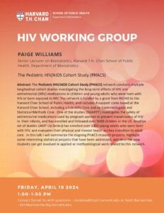 Paige Williams Senior Lecturer on Biostatistics, Harvard T.H. Chan School of Public Health, Department of Biostatistics The Pediatric HIV/AIDS Cohort Study (PHACS) Abstract: The Pediatric HIV/AIDS Cohort Study (PHACS) network…