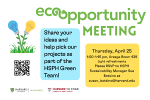 Come to the next EcoOp Meeting! Share your ideas and help pick our projects as part of the HSPH Green Team. Thursday, April 25, 1:00-1:45 pm, Kresge Room 439 (Take…