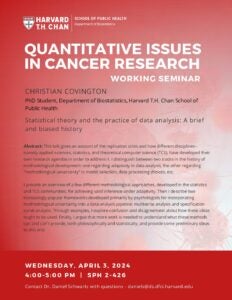 Christian Covington, PhD Student, Department of Biostatistics, Harvard T.H. Chan School of Public Health Statistical theory and the practice of data analysis: A brief and biased history Abstract: This talk…