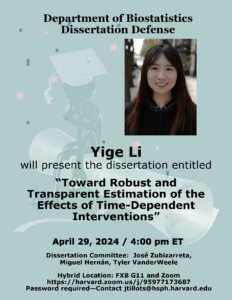 Yige will present the dissertation entitled “Toward Robust and Transparent Estimation of the Effects of Time-Dependent Interventions”. The dissertation committee is chaired by Dr. José Zubizarreta, and includes Dr. Miguel…