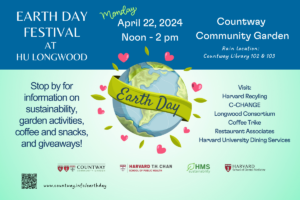 Stop by the Countway Community Garden at Longwood on Monday, April 22, from noon to 2 pm for information on sustainability, garden activities, snacks, and giveaways! Meet with Harvard Recycling,…
