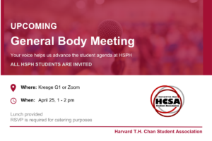Join Harvard Chan Student Association (HCSA) Officers for a general body meeting, hear updates on HCSA work, bring your concerns or suggestion to the officer board. A light lunch will…