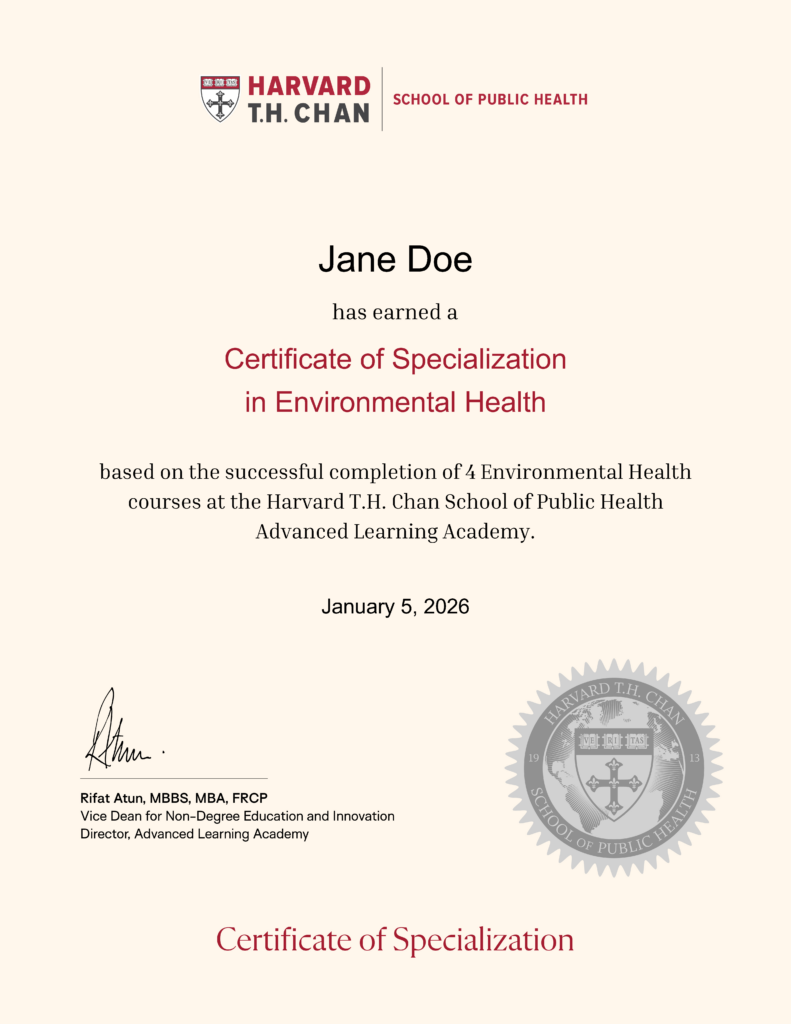 Harvard Chan ALA offers flexible learning pathways to match your goals. Short, primarily self-paced Fundamentals courses award a Certificate of Fundamentals. Longer, more in-depth courses with live components award a Certificate of Completion. You can also combine eligible courses to earn a Certificate of Specialization or an Advanced Certificate of Specialization, as outlined on this page.