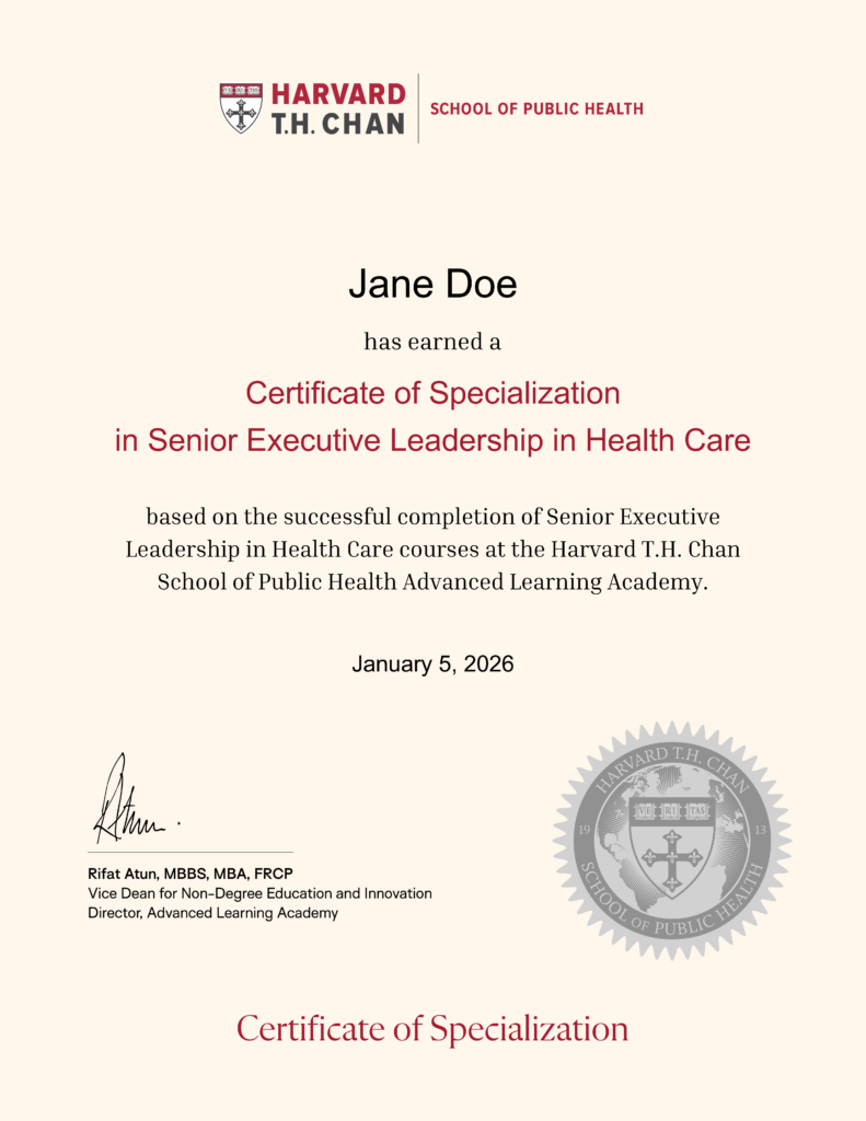 The Harvard Chan Advanced Learning Academy offers a portfolio of professional certificates designed to meet the evolving needs of public health and health care leaders. Whether you are looking to build foundational knowledge, deepen expertise in a focused area, or complete a multi-course specialization, our certificates provide flexible pathways to advance your impact.