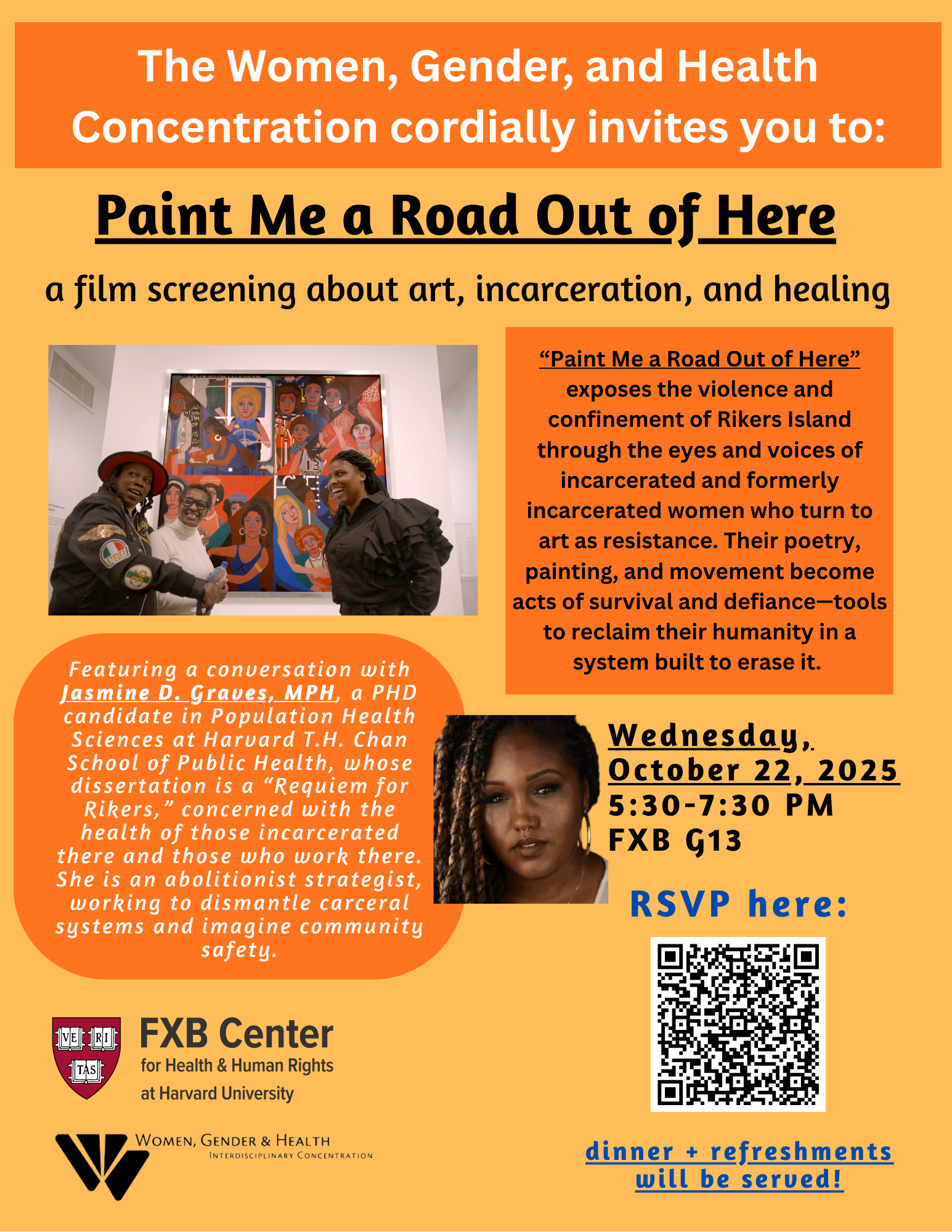 Join the Women, Gender and Health Concentration for a screening of the documentary “Paint Me a Road Out of Here” by director Catherine Gund. Featuring artists Faith Ringgold and Mary Enoch Elizabeth Baxter, the documentary exposes the violence and confinement of Rikers Island through the eyes and voices of incarcerated and formerly incarcerated women who turn to art as resistance. Their poetry, painting, and movement become acts of survival and defiance—tools to reclaim their humanity in a system built to erase it.