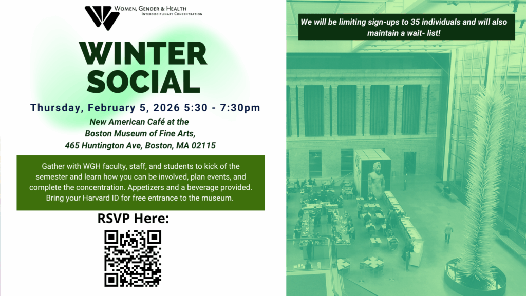 Women, Gender and Health Concentration Welcome Event – Thursday, September 4th, 2025 (1:00 – 1:50 PM, Kresge 110)