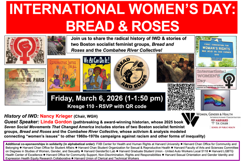 After an introduction to the history of International Women’s Day by the Chair of WGH Prof. Krieger, we will hear from our guest speaker Dr. Linda Gordon, Professor Emerita of History at New York University and author of many influential books on US social and political history, including Seven Social Movements that Changed America (2025). This book includes stories of two Boston socialist feminist groups, Bread and Roses and the Combahee River Collective, whose activism and analysis modeled connecting “women’s issues” to other 1960s-1970s campaigns against racism and other forms of inequality.