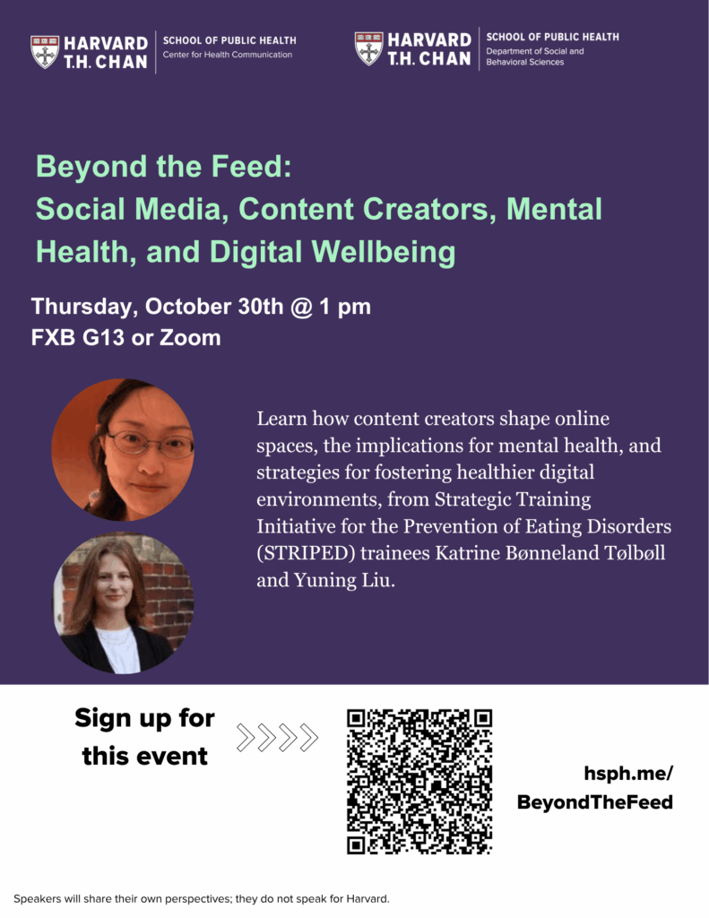 Register to join us for a timely conversation at the intersection of social media and youth well-being. Strategic Training Initiative for the Prevention of Eating Disorders (STRIPED) trainees Katrine Bønneland Tølbøll, MSc, MA, and Yuning Liu, MBBS, MS, will explore how content creators shape online spaces, the implications for mental health, and strategies for fostering healthier digital environments. This seminar will highlight fresh perspectives from emerging scholars and spark dialogue on how to move beyond the feed toward meaningful change.
