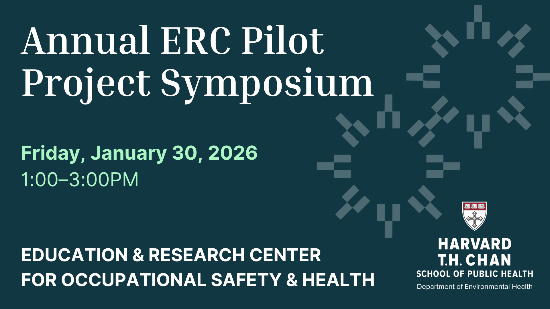 The Harvard Chan Education and Research Center (ERC) for Occupational Safety and Health invites you to the annual ERC Pilot Project Symposium to learn about recently completed Pilot Projects. These NIOSH-funded projects address concerns in one or more of the occupational safety and health areas of occupational hygiene, occupational epidemiology, occupational health services, occupational medicine, or occupational health nursing. Learn more.