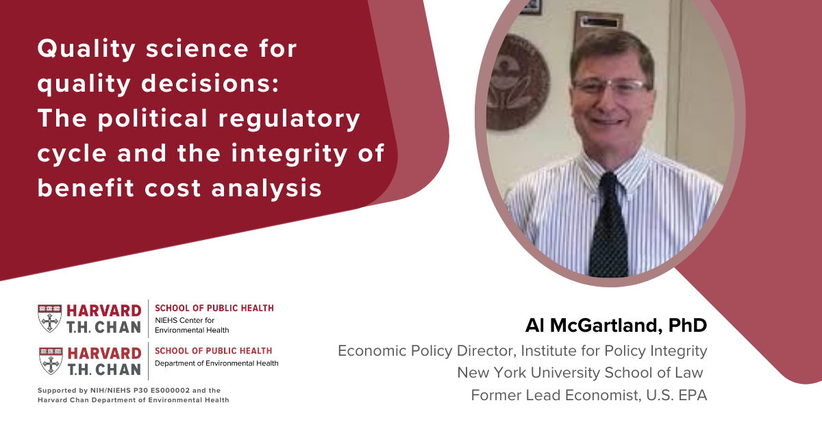 Please join the Harvard Chan NIEHS Center for Environmental Health and the Department of Environmental Health for a talk by Al McGartland, PhD, of New York University Law School’s Institute for Policy Integrity. Dr. McGartland will discuss “Quality science for quality decisions: The political regulatory cycle and the integrity of benefit cost analysis.”