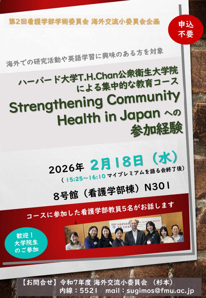 This week-long course will provide Japanese healthcare professionals with concentrated time and space to review Japan’s health system and services, as well as their own work, from an international perspective. While acknowledging the success of Japan’s transition to universal health care, participants will also then discuss ways of improvement individual and system wide. How can the current system and services be strengthened? What are the strategies for the future? What are the lessons learned from disasters and pandemics? What are the future roles of health professionals, including public health nurses, nutritionists, and many others?