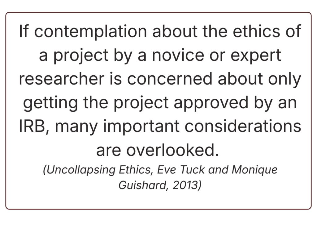 Panelists also spoke about the value of formal IRB review. Cora reflected on how the IRB process can sharpen researchers’ intentions, forcing clarity about who is collecting which data, for what purposes, and with what safeguards. At the same time, Junita described experiences negotiating local review processes and navigating ethical dilemmas that were not captured by IRB protocols, while Sonali highlighted nuanced dynamics within practice‑based and service‑oriented projects that may not require formal IRB approval at all.