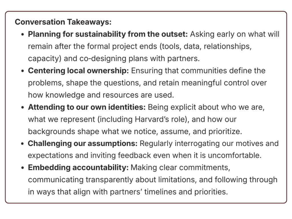 A recurring theme was the idea of “entry and exit” as ethical practices in their own right. Trust is not only built through how we arrive in a community; it is tested and revealed in how we leave. Our panelists emphasized that the story of a partnership is told as much by its conclusion as by its launch: Do we close loops with community partners? Are we transparent about what will and will not continue after students or funding cycles end? What responsibilities remain after a deliverable is submitted, or a dataset is analyzed?