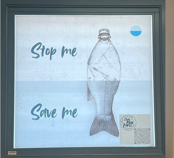 A sign for the Clean Blue Paros initiative at the Paros airport.