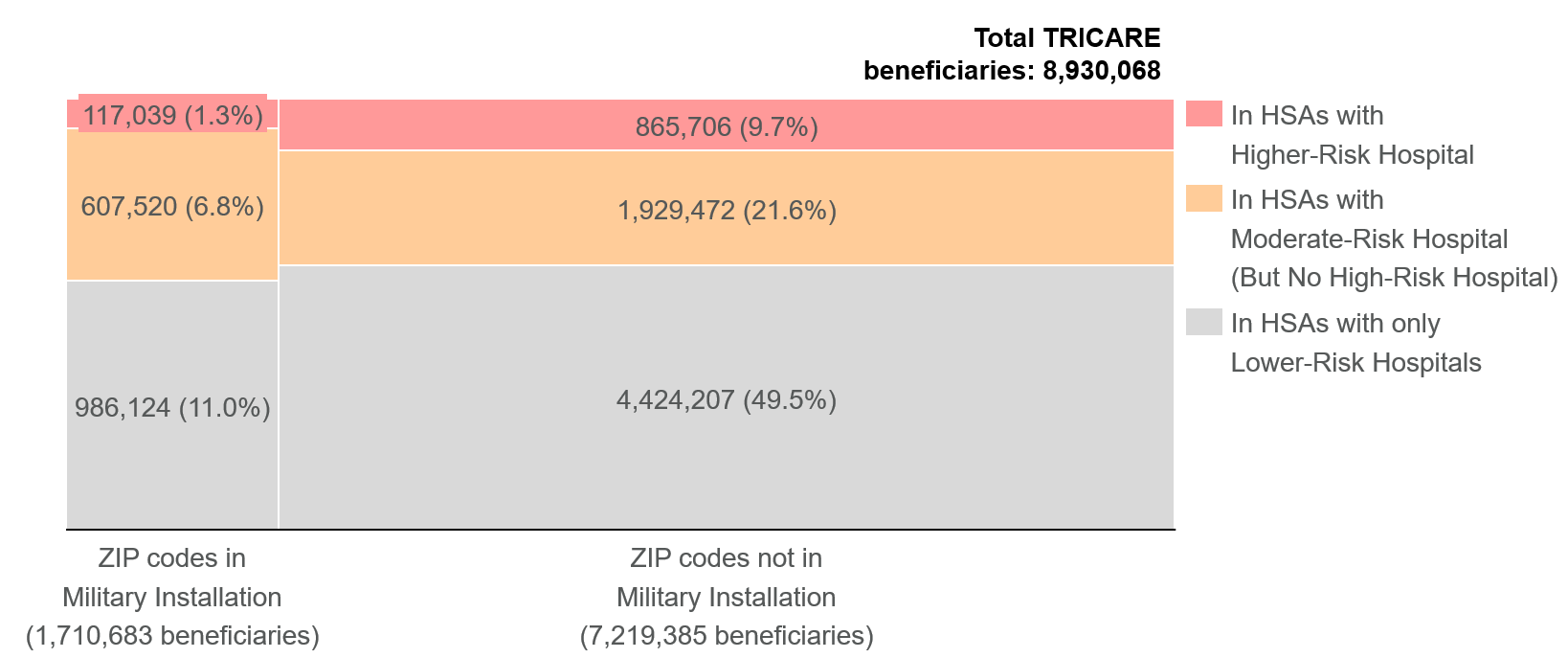 Approximately 8.9 million TRICARE beneficiaries reside in ZIP codes that could be linked to Hospital Service Areas. Of this number, 0.98 million (11.0%) are potentially exposed to higher-risk hospitals, and 2.54 million (28.4%) are potentially exposed to moderate-risk hospitals.