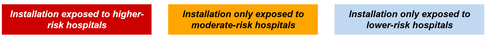 We then examined the number and proportion of beneficiaries within military installations who are potentially exposed to moderate-risk or higher-risk hospitals.