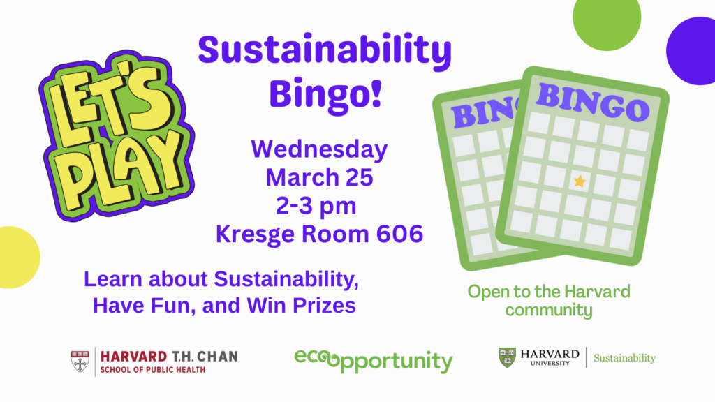Join us on Wednesday, March 25, 2026 from 2-3 pm for Sustainability Bingo in HSPH Kresge 606. It’s going to be fun!