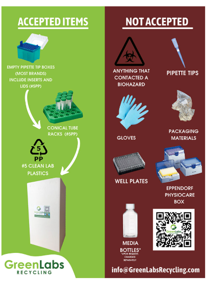 HSPH works with GreenLabs Recycling to have our pipette tip boxes collected and recycled. They can recycle tip boxes from all manufacturers EXCEPT Opentrons brand and Eppendorf’s ‘Physiocare’ box. Do not use biohazardous waste bags for these items. Please see the tip box recycling standards below. Pipette tip boxes can be dropped off in the designated cardboard bins near the HSPH Building 1 loading dock. (Follow signs to the mailroom.)