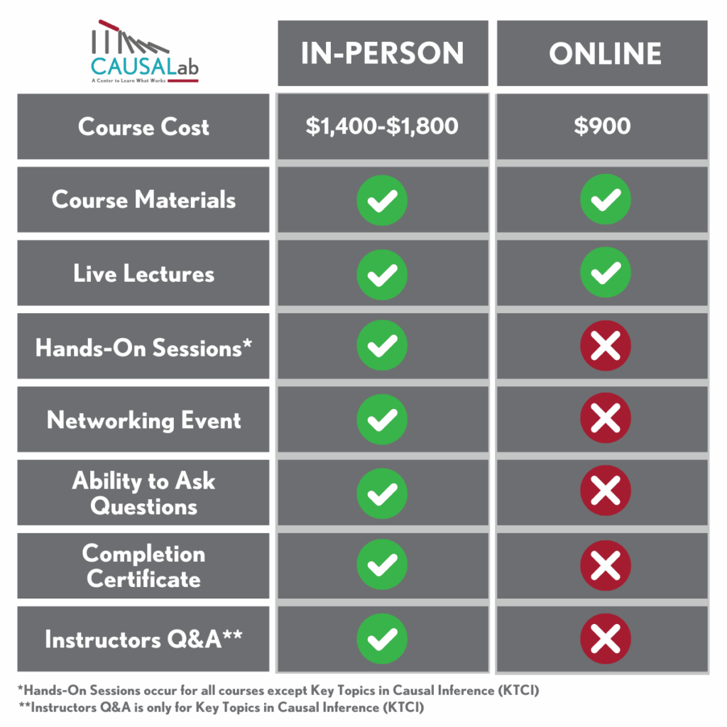 Participants have 48 hours from their registration confirmation to cancel their order and receive a full tuition refund. After 48 hours, no refunds will be allowed. For online courses, CAUSALab and Harvard University are not liable for any technical problems or system failures on a user’s end. Participants attending the online courses are responsible for their own access to a digital device and reliable internet connection.
