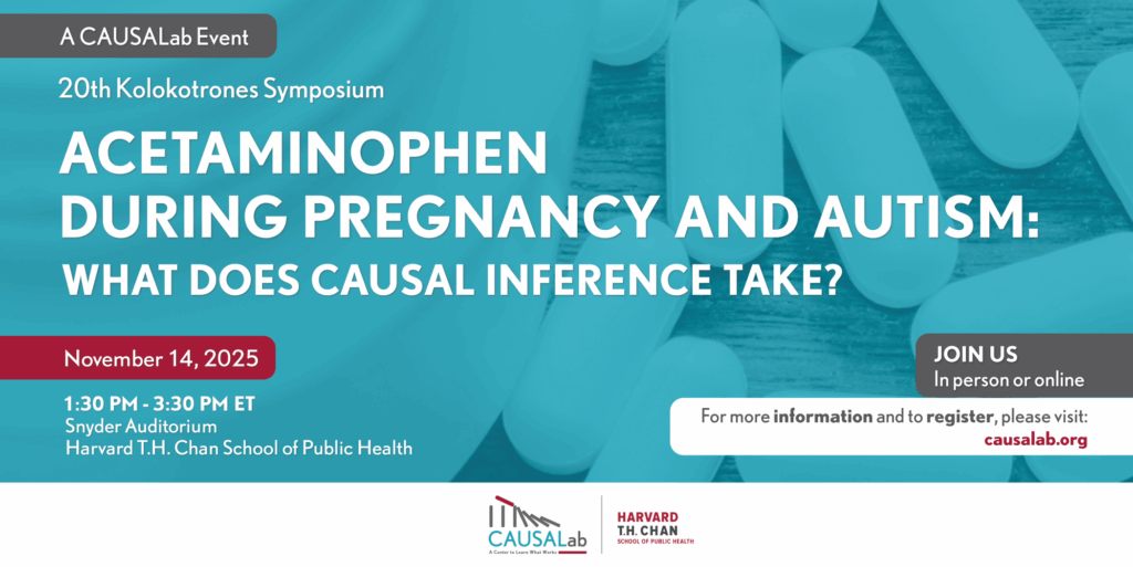 The Kolokotrones Symposium is a biannual event featuring panelists from CAUSALab as well as partner organizations, such as academic institutions, research centers, and government agencies. The symposia are hosted both in-person at Harvard T.H. Chan School of Public Health, and virtually via Zoom. Past symposium topics have included causal inference in pregnancy, cardiovascular devices, suicide prevention, secure data environments, COVID-19 and more.