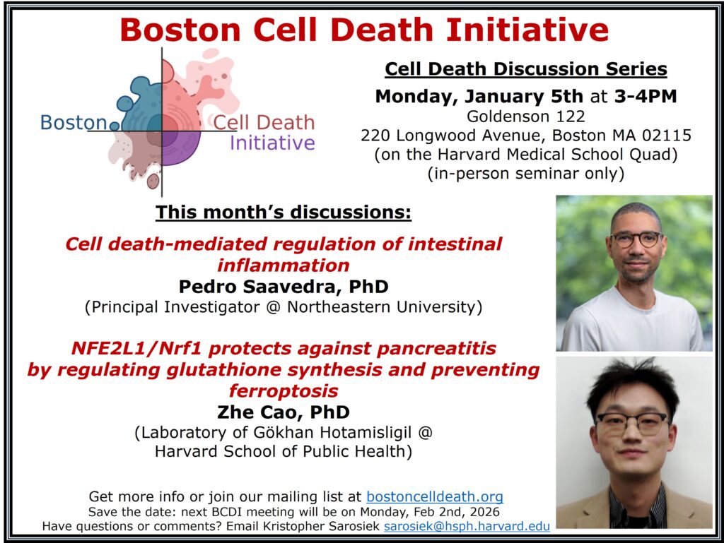 The Boston Cell Death Initiative brings together laboratories in the Boston area and beyond that work on various aspects of cell death. We hold a monthly discussion series during which two principal investigators or trainees each present a 20-minute talk with an additional 10 minutes earmarked for active discussion. Mirroring the broad interests of our member laboratories, our series covers cell death from immunology to toxicology, from cancer to neurodegeneration, and from molecular mechanisms to patient outcomes. Learn more….