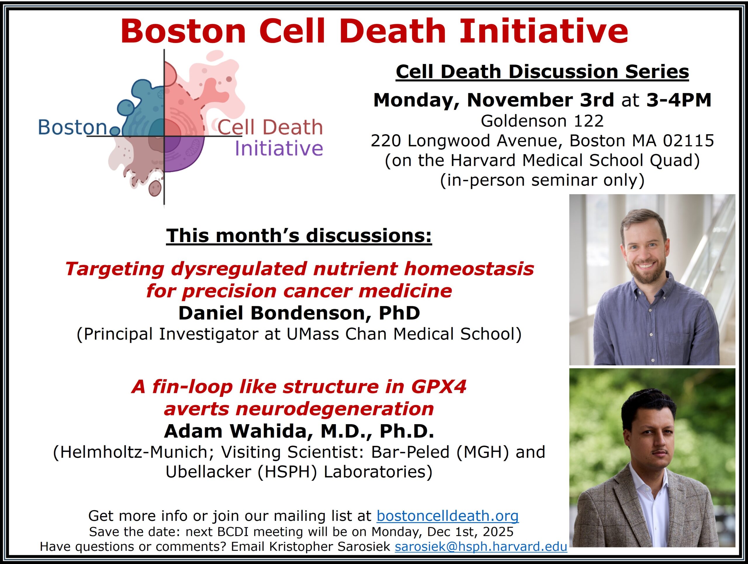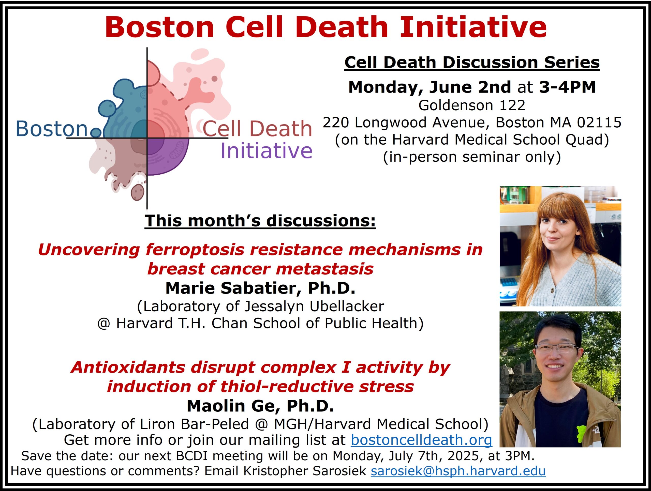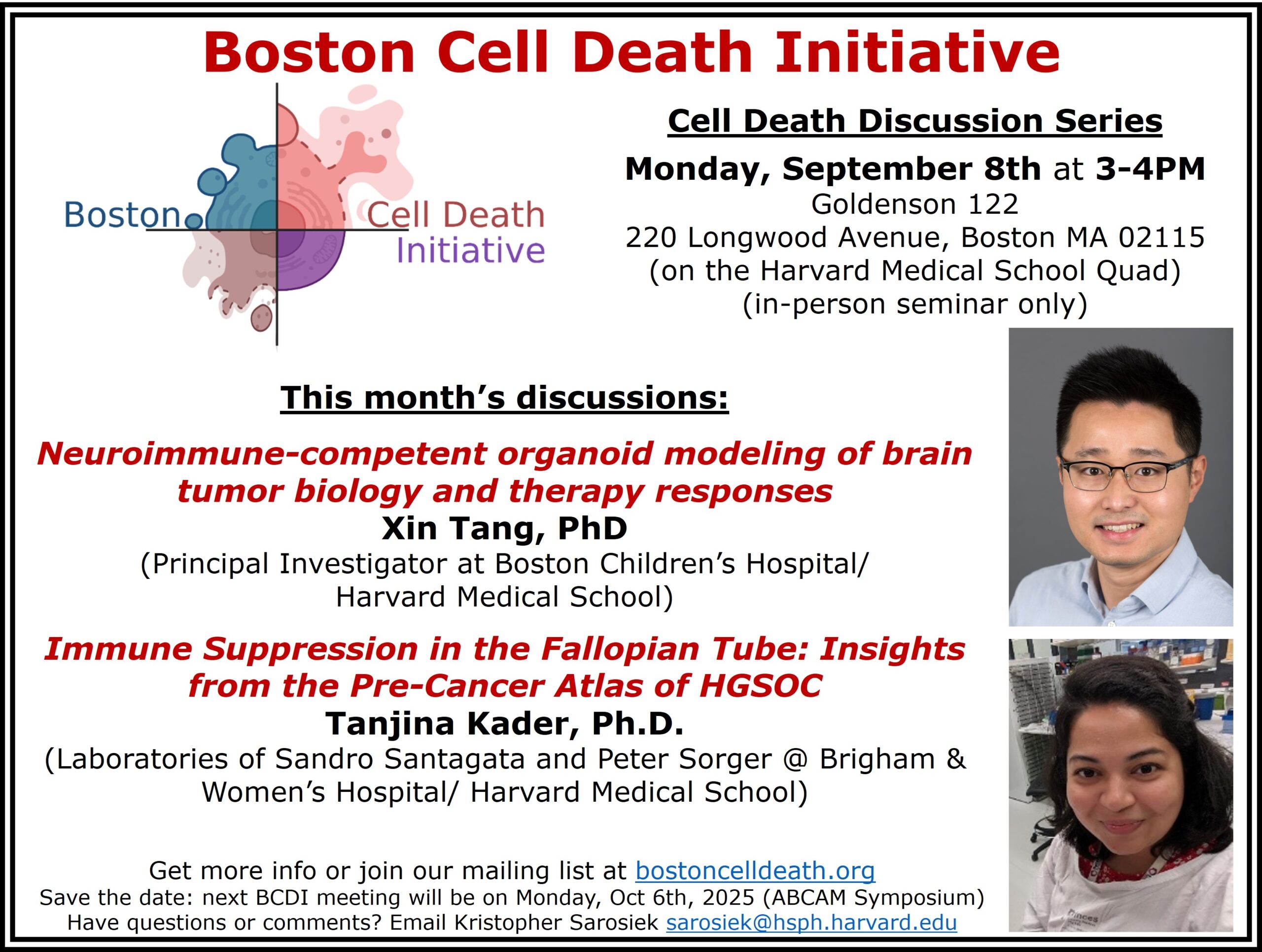 The Boston Cell Death Initiative brings together laboratories in the Boston area and beyond that work on various aspects of cell death.