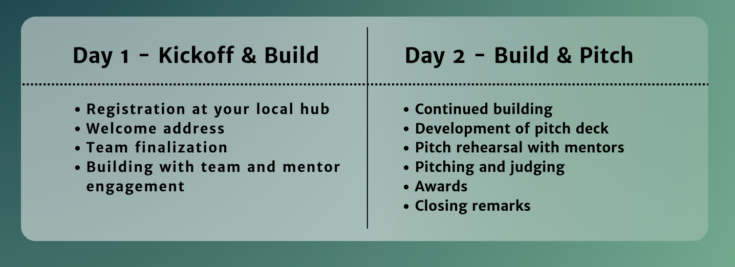 Dates reflect the 2026 Hackathon and Venture Building Program. Local hubs may run supplementary sessions.