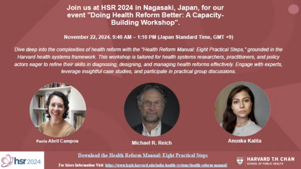 We are pleased to announce our event at HSR 2024, Doing Health Reform Better: A Capacity-Building Workshop, led by Michael Reich, Abril Campos and Anuska Kalita.