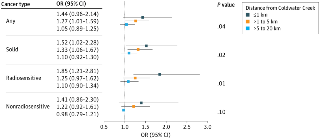 Reference: Leung, M., Tang, I. W., Lin, J. J. Y., Mucci, L., Farmer, J. G., McAlaine, K., Mangano, J. J., & Weisskopf, M. G. (2025). Cancer Incidence and Childhood Residence Near the Coldwater Creek Radioactive Waste Site. JAMA Network Open, 8(7), e2521926. doi:10.1001/jamanetworkopen.2025.21926